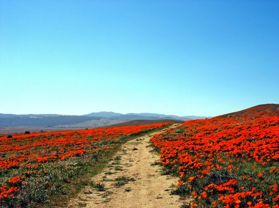 I love the wind undulating across hills of grass, and California poppies in full bloom by the road side. I love the spring sky, its sweetness of blue piled with white clouds and the sun striking green spring trees with dark grey-blue skies behind. I love lightning and thunder. I love flocks of birds reeling in the sky, flashing back and forth as they turn, and bare winter trees when you can see bird nests. I love the bird songs in the morning and holding a stunned bird to right it so it can fly once again, it is like holding air. I love cats, the way they flow across the earth, the softness of their paws. I love the constant shush of the waves as they slide up the seashore and the vastness they come from. These make my heart glad.